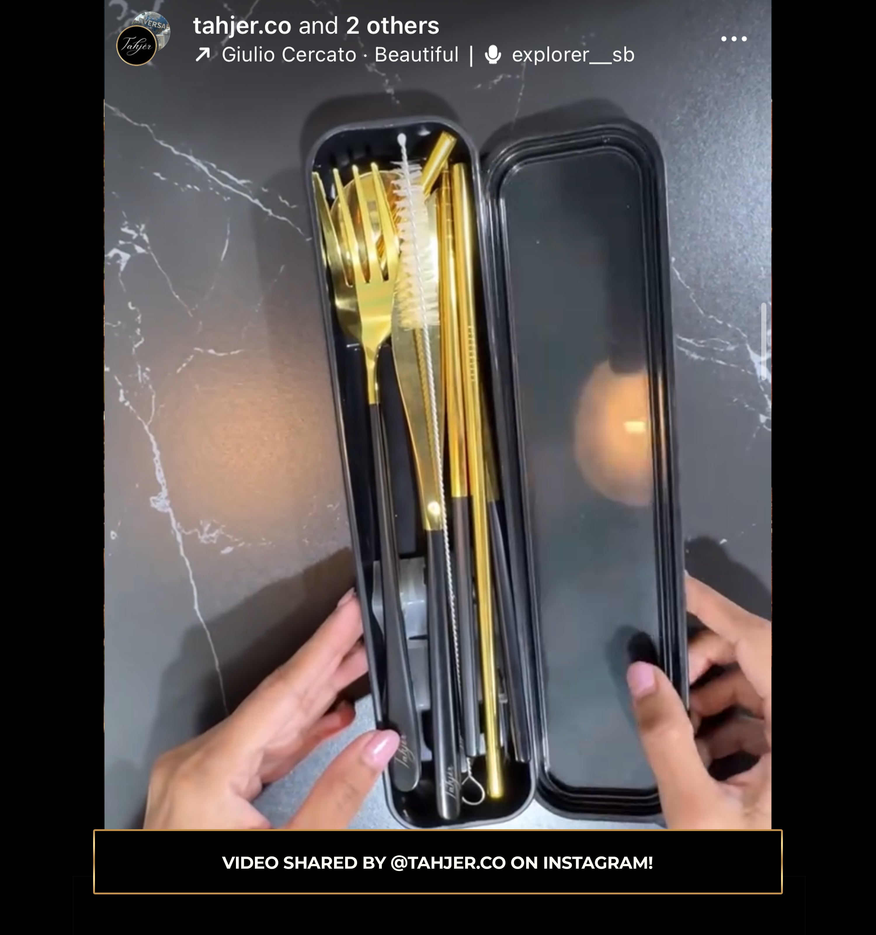 From your desk lunch to your next getaway, Tahjér cutlery sets are built for life on the go. Each set includes: spoon, fork, knife, chopsticks, straight straw, bent straw, and cleaner — all in a sleek travel case.