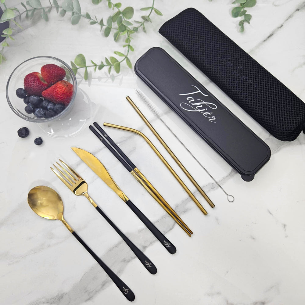 Koku Trousse is our black and gold 8-piece set paired with a black case. It is made of high-quality food grade stainless steel. This set is easy clean, dishwasher safe and essential to everyday use. It's perfect for festivals, lunch, dining, flights and so much more.