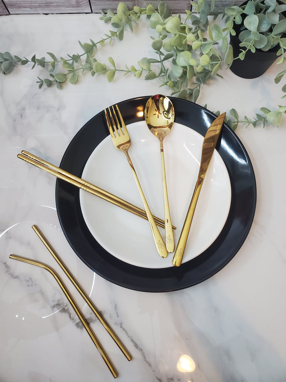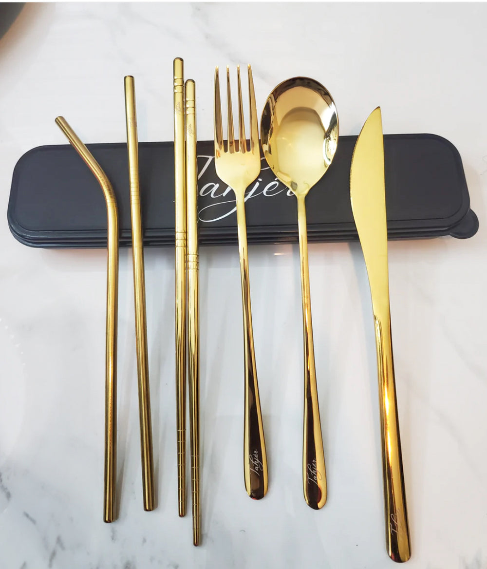 Signature 1 Travel Cutlery Set is our gold 8-piece set paired with a black case. It is made of high-quality food grade stainless steel. This set is easy clean, dishwasher safe and essential to everyday use. It's perfect for festivals, lunch, dining, flights and so much more.