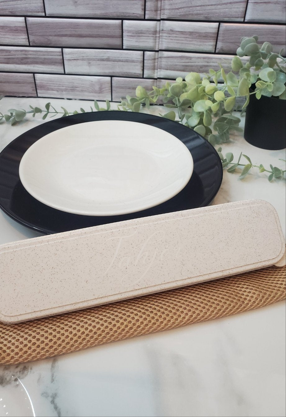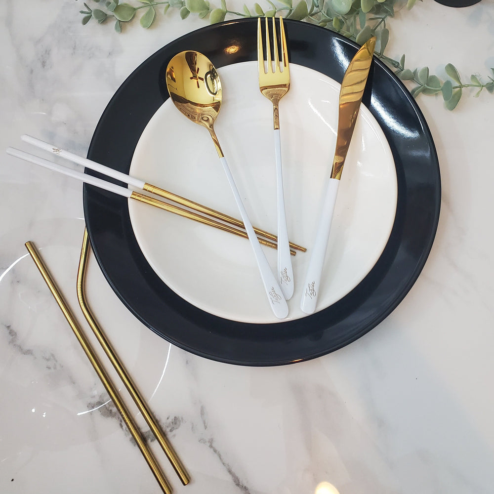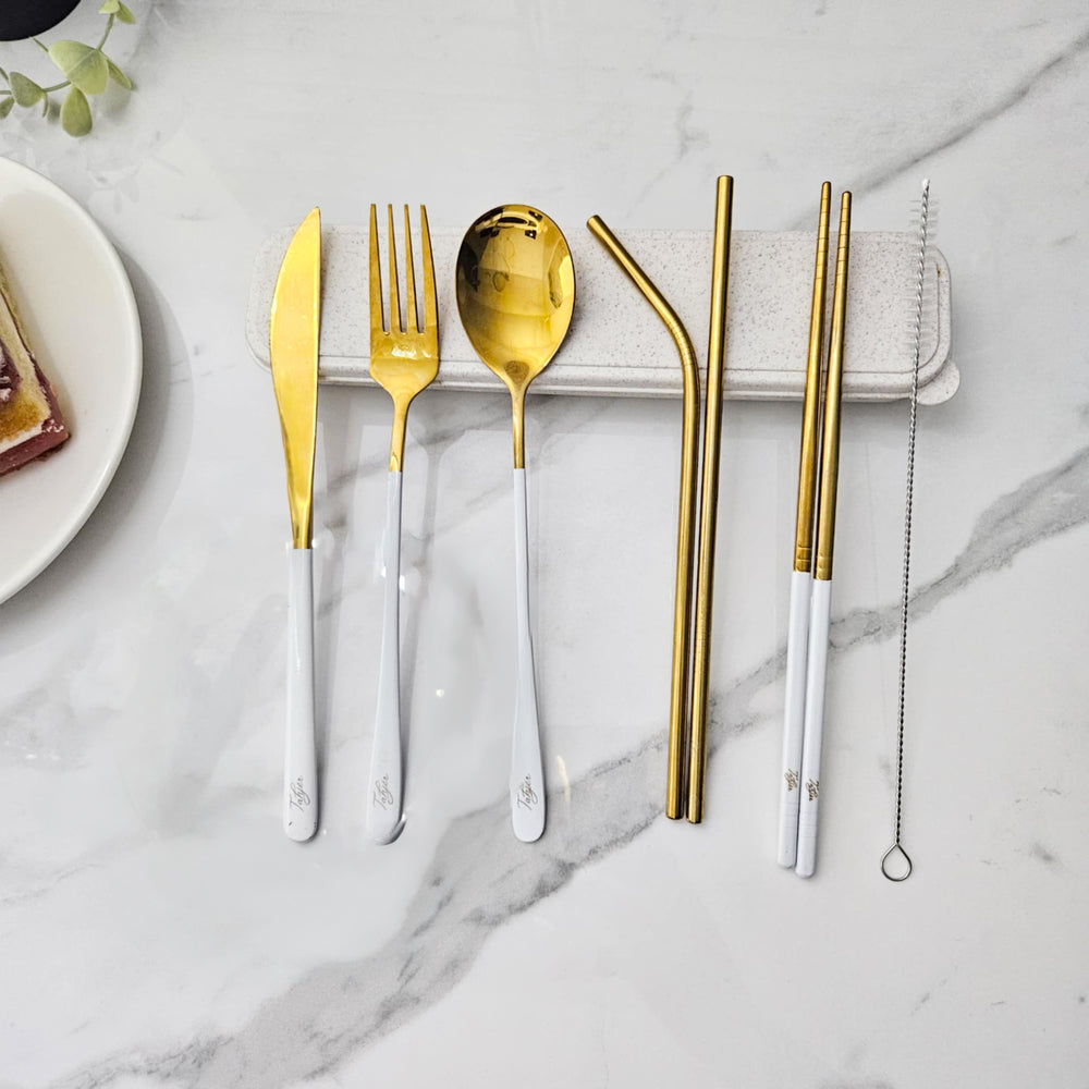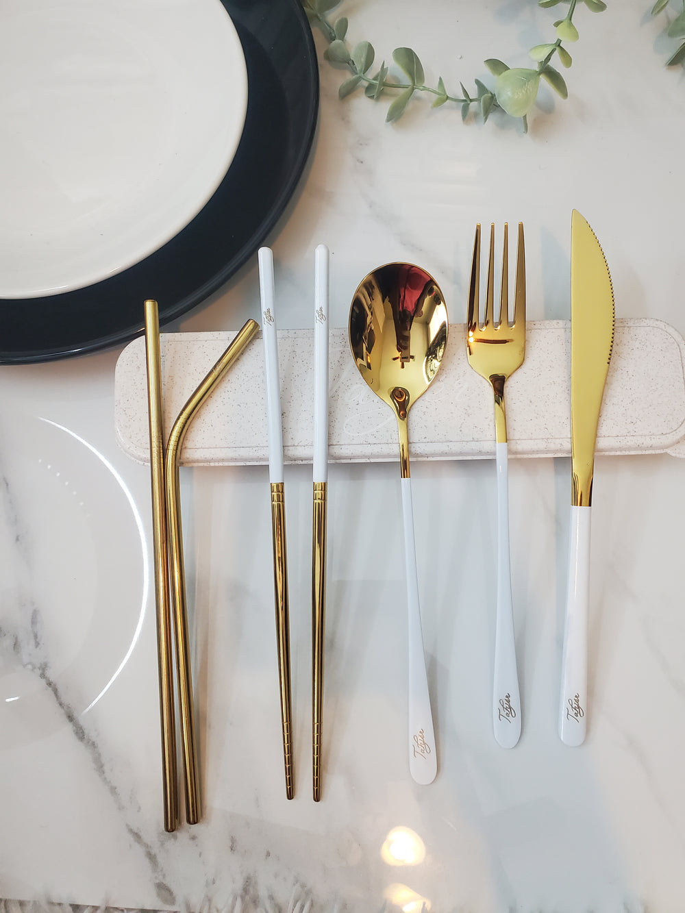 Créme Trousse is our white and gold 8-piece set paired with a beige case color. It is made of high-quality food grade stainless steel. This set is easy clean, dishwasher safe and essential to everyday use. It's perfect for festivals, lunch, dining, flights and so much more.